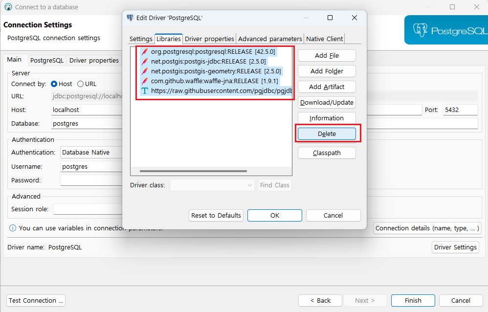DBeaver 툴 설치 후 Tool 상에서 Postgresql DB 연결을 위해 jdbc 드라이버 설정을 해준다.