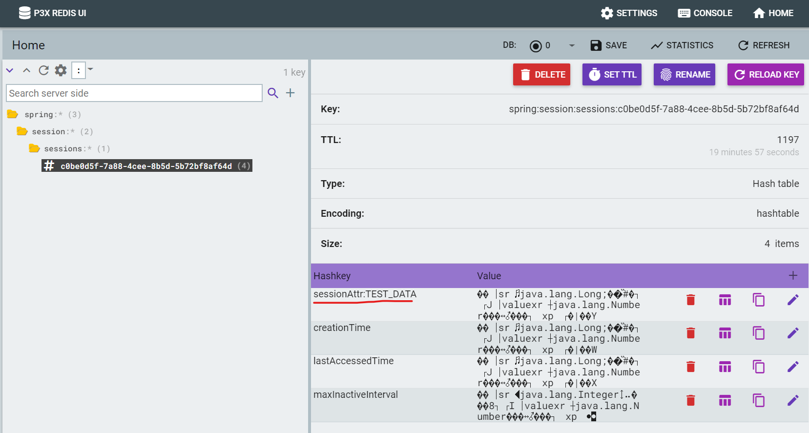 P3X REDIS Client tool을 깔고 레디스 내용을 살펴보면 spring -> session 항목에 세션이 생성되어 있음을 볼 수 있고 세션 내용을 열람하면 아래와 같이 테스트 Rest api에서 저장한 TEST_DATA 세션 값이 있음을 볼 수 있다.