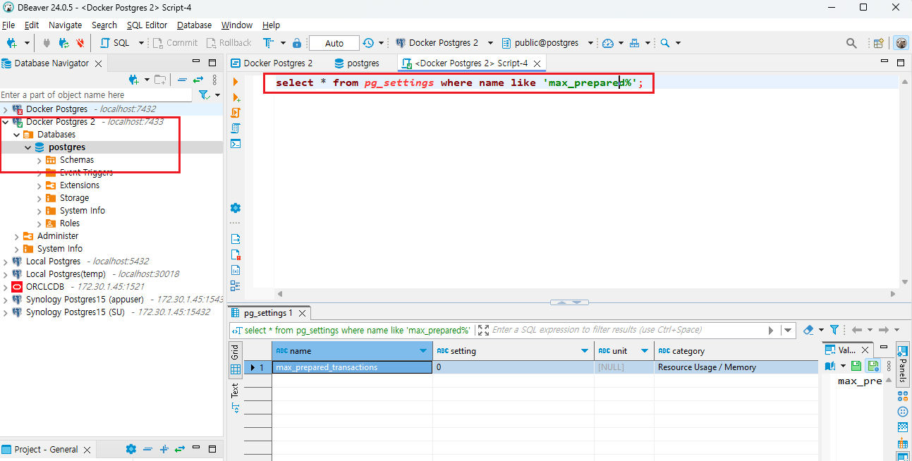 Container를 재기동하면 DB 도 같이 재기동 되어서 기동 후 Tool에서 PG_SETTINGS의 Max Prepared_transactions를 읽어보면 설정한 대로 100으로 나타냄을 볼 수 있다.