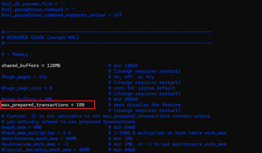 vim 설치 후에 vi /var/lib/postgresql/data/postgresql.conf를 열고 테스트로 max_prepared_transactions 항목을 100으로 늘려본다.