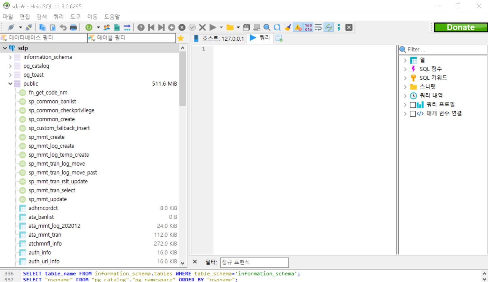 덤프를 수행하기전 덤프 대상 데이터베이스 모습이다. 여러 프로시저와 테이블이 존재함을 볼 수 있다.