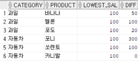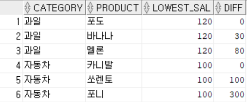 예제1. 각 카테고리별로 최저값을 구하고 각 카테고리별로 모든 물품의 최저값과의 차이를 구해라