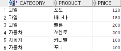 다음과 같이 간단한 데이터 테이블이 있다고 가정하자.... 카테고리별로 물품이 있고 각 물품은 가격을 가지고 있다.