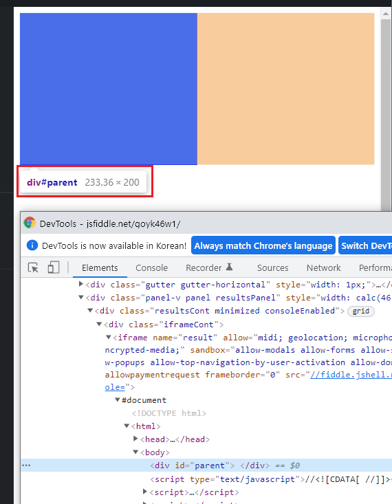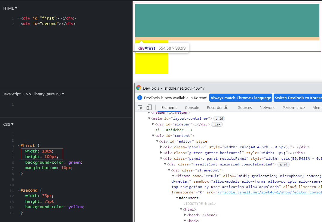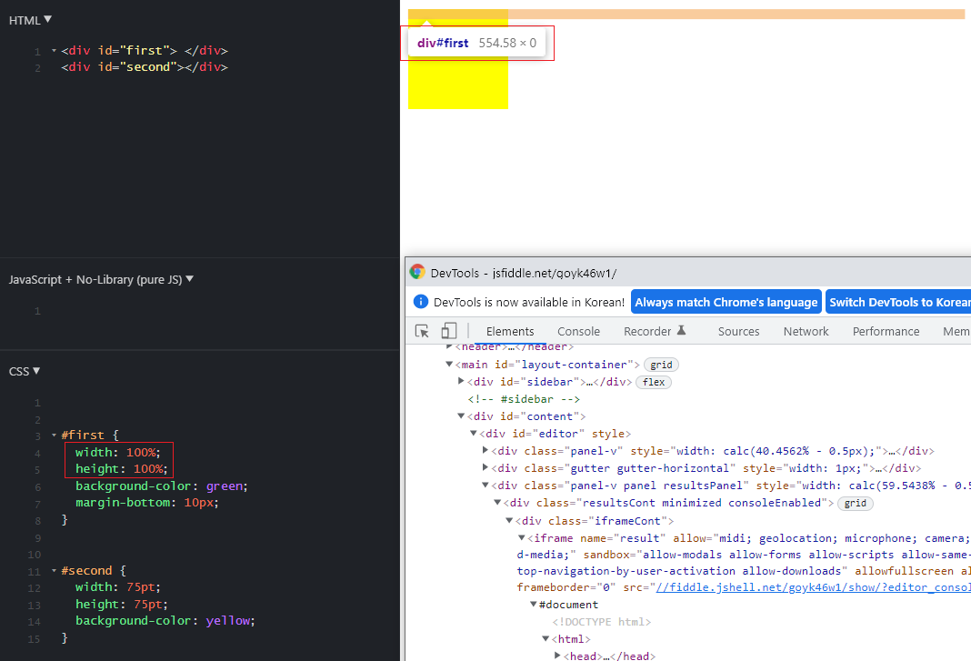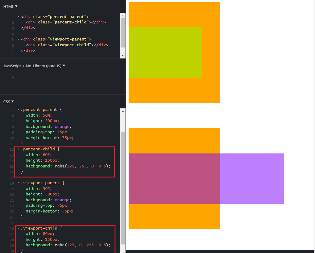 이 시점에서는 Viewport 단위는 % 지정 것처럼 보일지 모른다. 그러나 Viewport 단위와 % 사이에 큰 차이가 있음. % 지정 되어있다면 자식 요소의 폭과 높이는 부모 요소의 폭과 높이에 결정 된다.