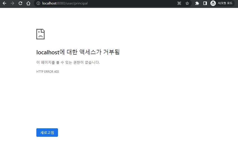 반면 위에서 살펴본대로 SecurityConfig에서 다른 url들은 Authentication을 거치도록 설정하였으므로 로그인 없이 url진입 시 엑세스 거부 화면이 출력 됨을 알 수 있다.