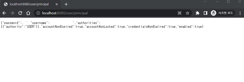 인증 완료 후 http://localhost:8080/user/principal 을 실행하면 정상적으로 인증 정보를 가져옴을 볼 수 있다.
